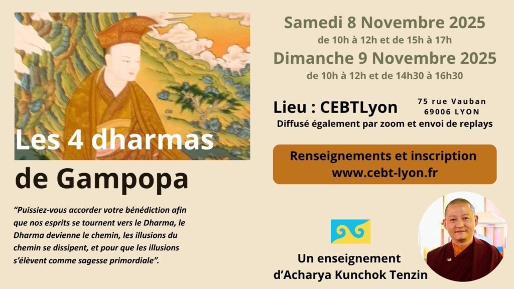 L’objet des « 4 dharmas de Gampopa » est très pragmatique et à la fois très profond. Ils répondent à la question : c’est quoi la pratique du dharma ? comment est ce que l’on pratique le dharma ?