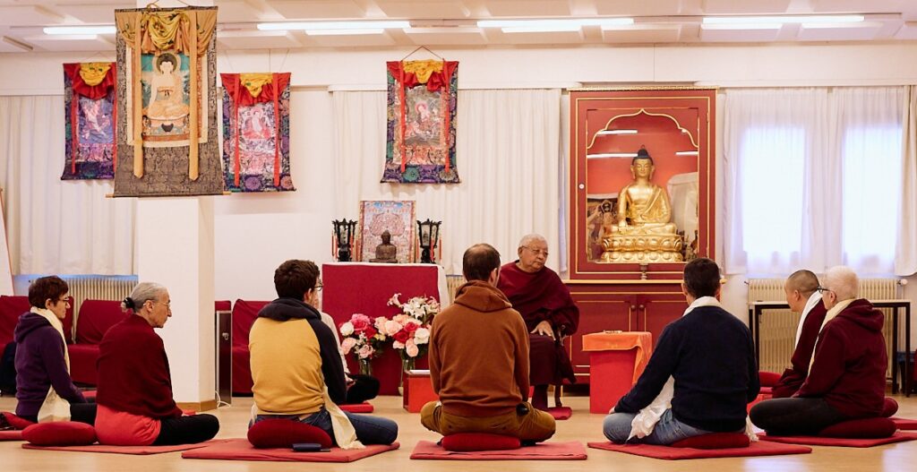 Le 9 mars 2024, la nouvelle équipe en charge du CEBTLyon, accompagnée d’Acharya Kunchok Tenzin, était reçue par lama Jigmé Rinpoché, à l’occasion de son séjour à Montchardon. S’inscrivant dans la continuité de lama Teunsang, ses conseils et ses souhaits pour le CEBT de Lyon nous ont guidés dans le redémarrage des activités. Rinpoché nous a donné quelques clés pour faire vivre un centre urbain du dharma, tout en nous invitant à la patience et à la persévérance, tant il est difficile aujourd’hui de dynamiser ce type de centre.